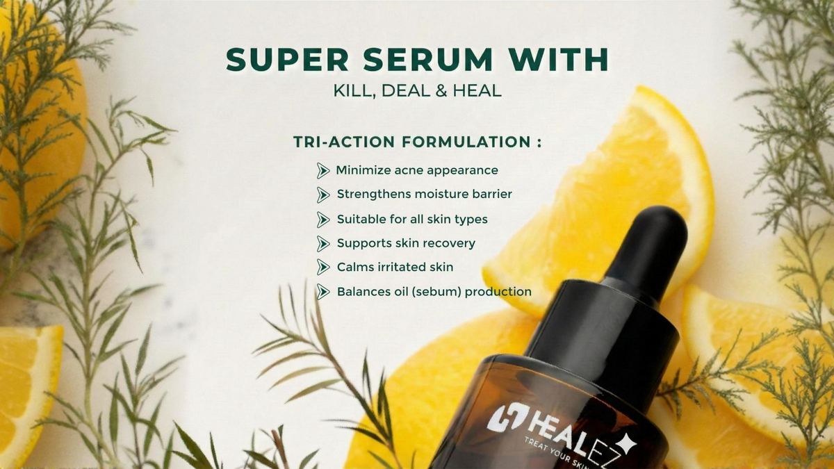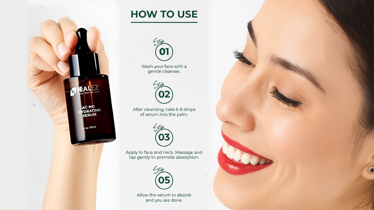 Healez Ac-No Hydrating Serum: Balancing oily, acne-prone skin without over-drying is now possible with our lightweight, deeply hydrating formula. This serum is designed to help improve skin clarity, calm visible breakouts, and support a healthy barrier. It helps restore the skin’s natural defense system to maintain clear-looking skin and minimize the chance of future blemishes. Visibly smoother texture, refined pores, and an even-toned complexion are among the noticeable results.